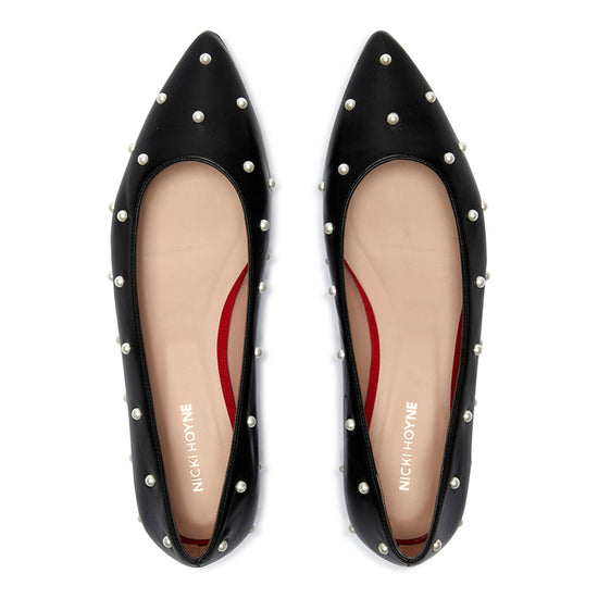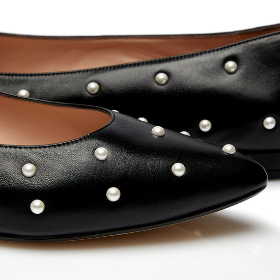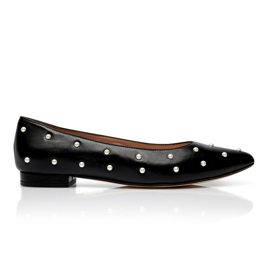 The Bon Bon Flat in Black Leather with Pearl Studs is your go to for polished sophistication with a playful twist.