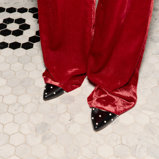Classic elegance with a twist. The Bon Bon Flat in Black Leather with Pearl Studs is a timeless staple reimagined with playful, fashion forward flair. Part of the new Bon Bon Collection by Nicki Hoyne, this sleek pointed toe flat is handcrafted in Spain from soft black leather and adorned with delicate pearl style studs for a refined yet edgy finish.