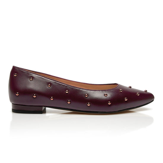 With its rich burgundy hue, luxurious leather, and striking studded detail, the Bon Bon Flat is your top choice for everyday sophistication with a playful twist.