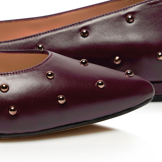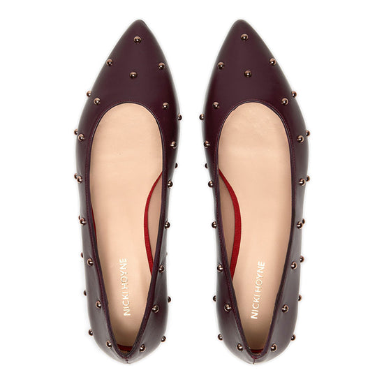 Timeless style meets bold detail. The Bon Bon Flat in Burgundy Leather with Metallic Chestnut Studs is a sophisticated wardrobe staple reimagined with modern flair. Part of the signature Bon Bon Collection by Nicki Hoyne, this sleek pointed-toe flat is handcrafted in Spain from premium burgundy leather and finished with polished studs for a chic yet edgy look.