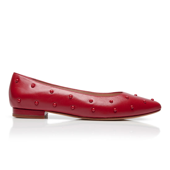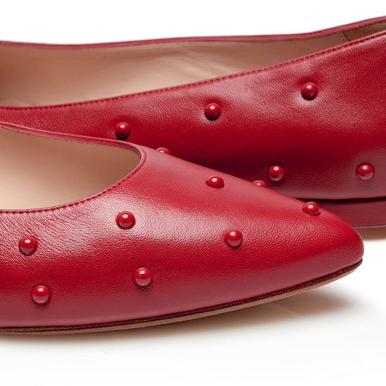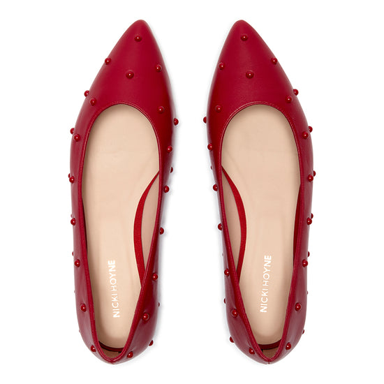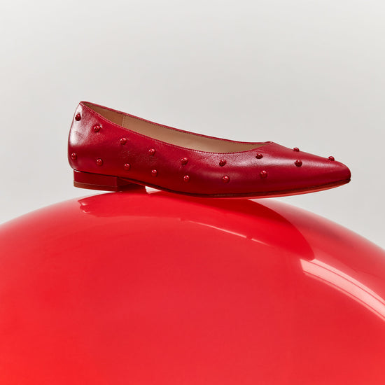 Bold doesn't have to mean high heels. Meet the Bon Bon Flat in Red Leather with Red Studs, a fearless take on everyday elegance from the new Bon Bon Collection by Nicki Hoyne. Crafted in Spain from buttery soft red leather and finished with tonal red stud detailing, this pointed toe flat is where comfort meets statement style.