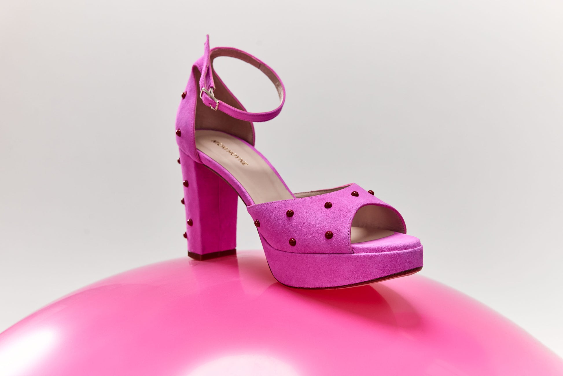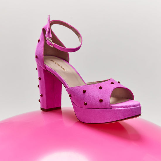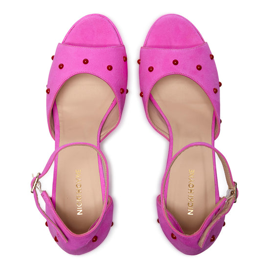 Add a touch of playful glamour to your outfit with the Bon Bon Platform in Pink Suede with Red Studs, a signature statement from the new Bon Bon Collection by Nicki Hoyne. Designed to celebrate colour, confidence, and individuality, this show stopping style is crafted in Spain from luxurious pink suede and finished with glossy red stud detailing for a standout look.