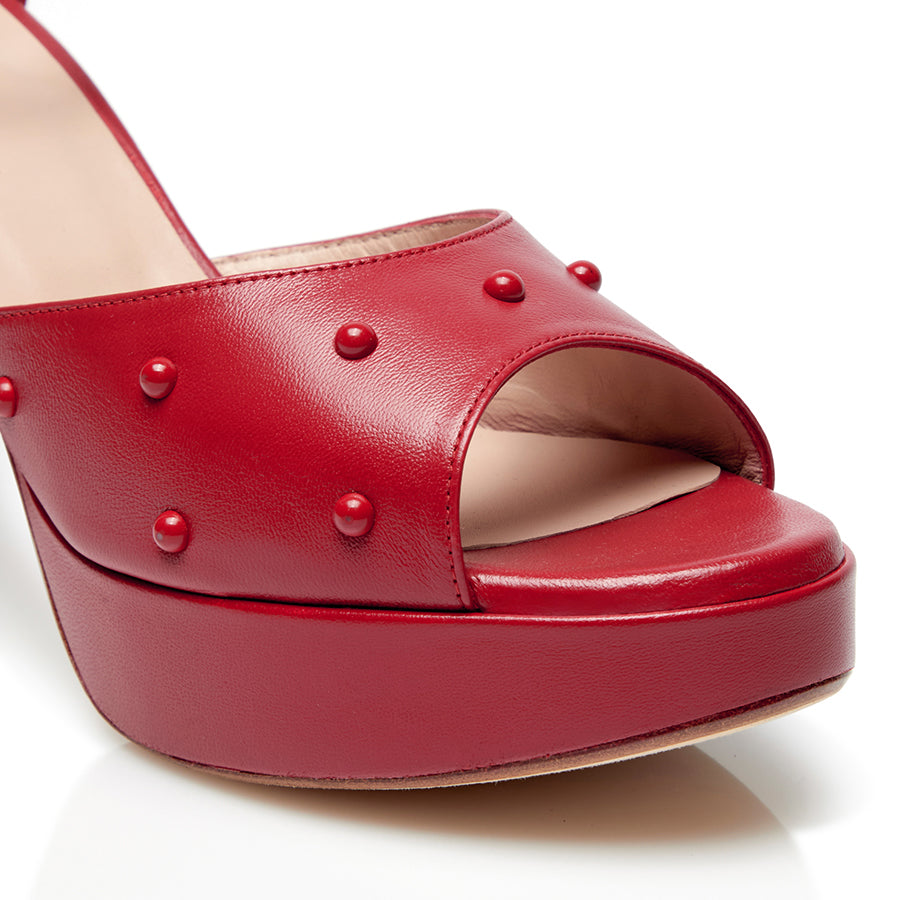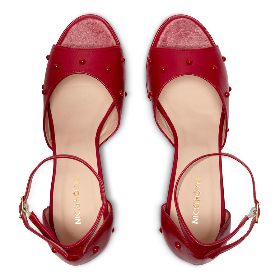 Power, polish, and playful glamour come together in the Bon Bon Platform in Red Leather with Red Studs, a bold statement heel from the new Bon Bon Collection by Nicki Hoyne. Crafted in Spain from rich red leather, this high impact style is finished with glossy tone-on-tone red stud embellishments that add texture and edge to every step.