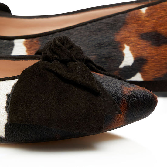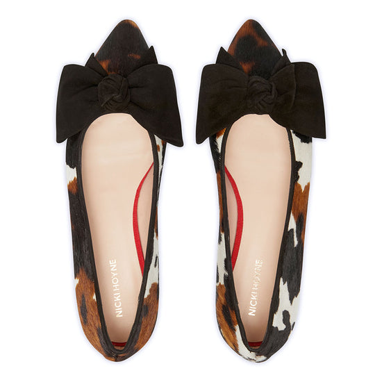 Playful print meets timeless design in the Bow Flat in Cow Print Hair with Black Suede Bow from Nicki Hoyne. Handcrafted in Spain, this pointed toe flat features an updated cow print from the AW24 trainer collection, crafted in luxurious pony hair leather. A soft black suede bow adds contrast and elegance, giving the shoe a chic, fashion forward edge.