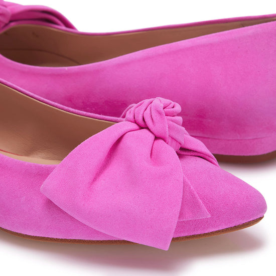 The Nicki Hoyne Bow Flats, a stunning fusion of opulence and comfort. Crafted in Spain from high quality neon pink suede, these flats are designed to make a statement. The pink suede oversized bow adds a sophisticated touch to the sleek pointed toe and barely there heel, creating a unique and luxurious look. Perfect for those who want to stand out without compromising on comfort.
