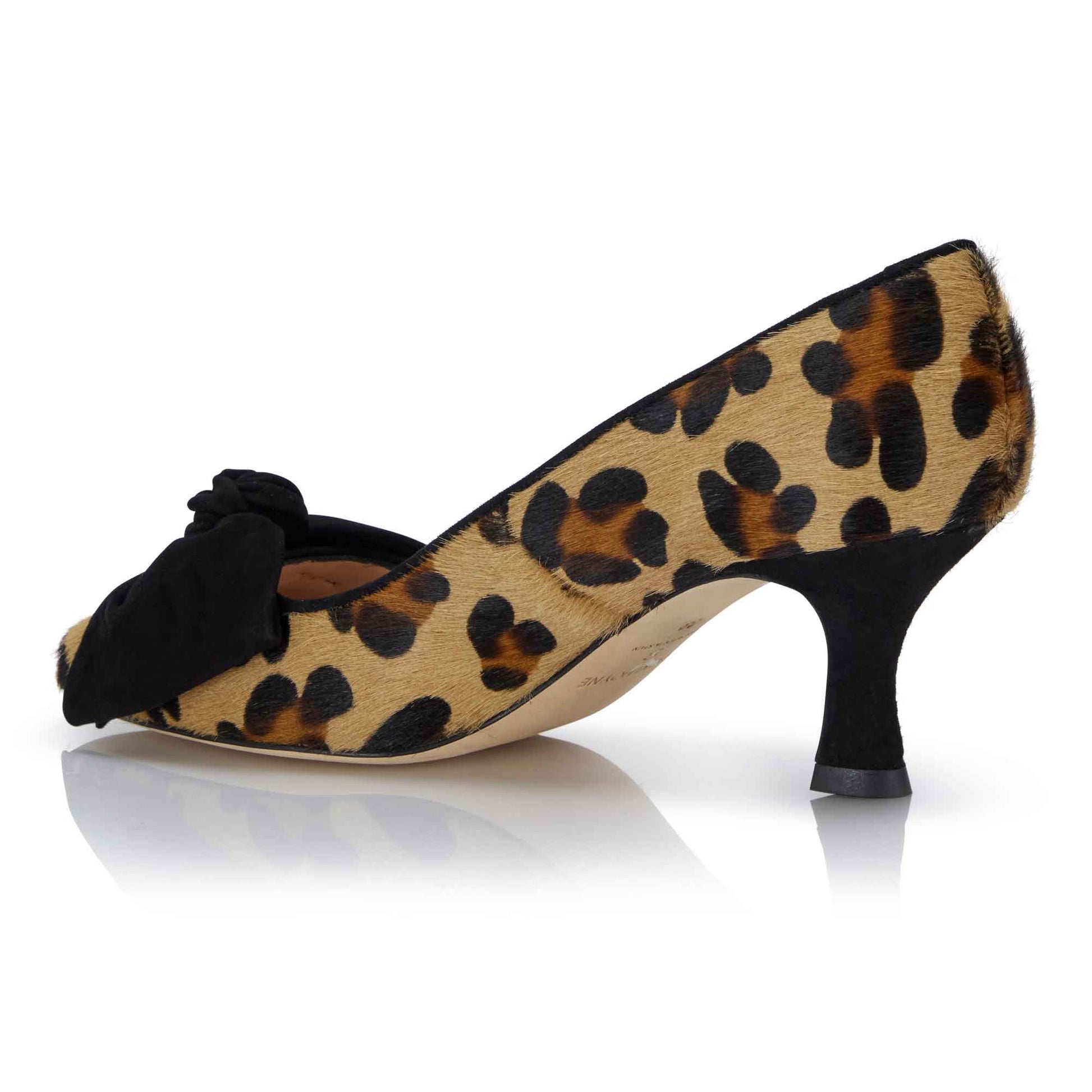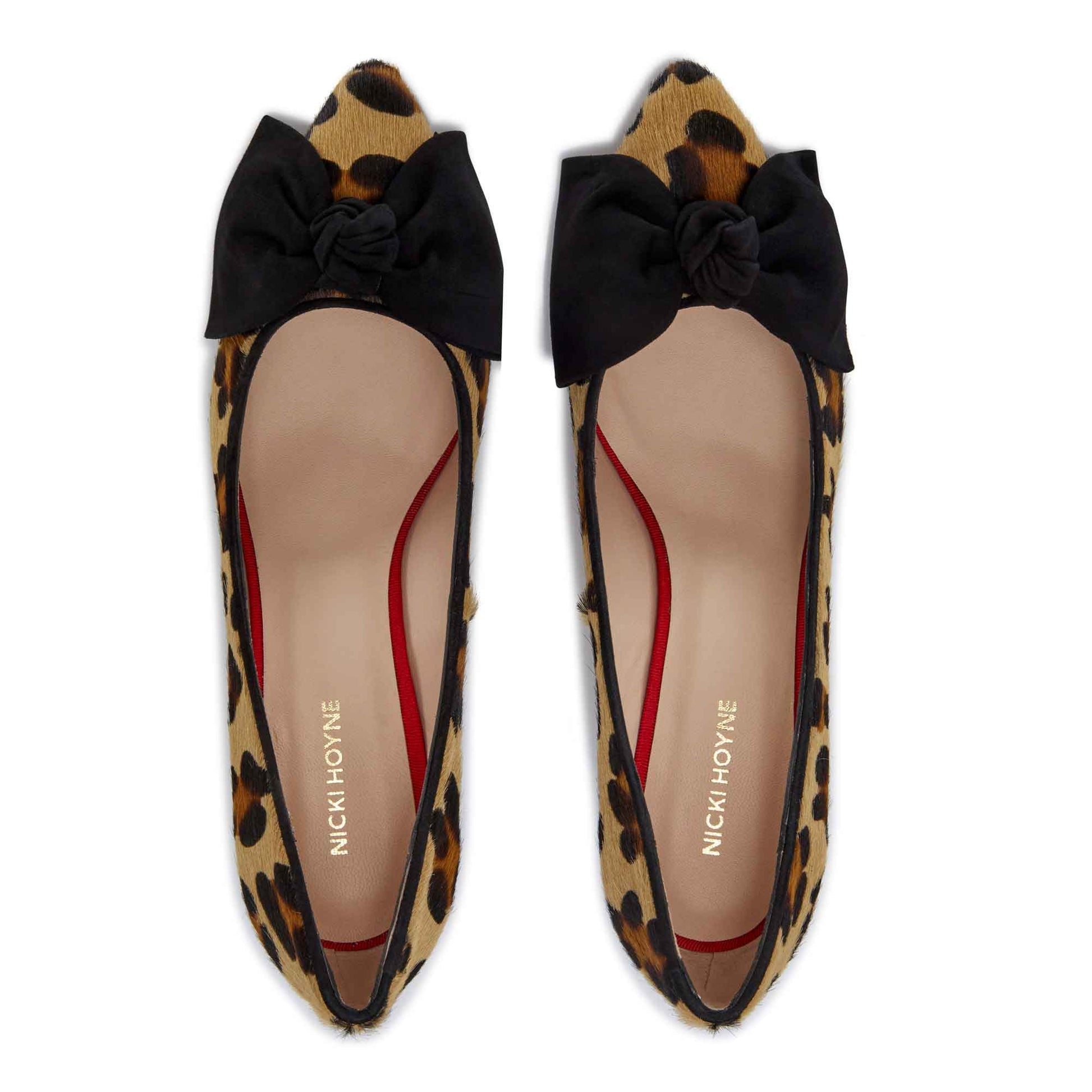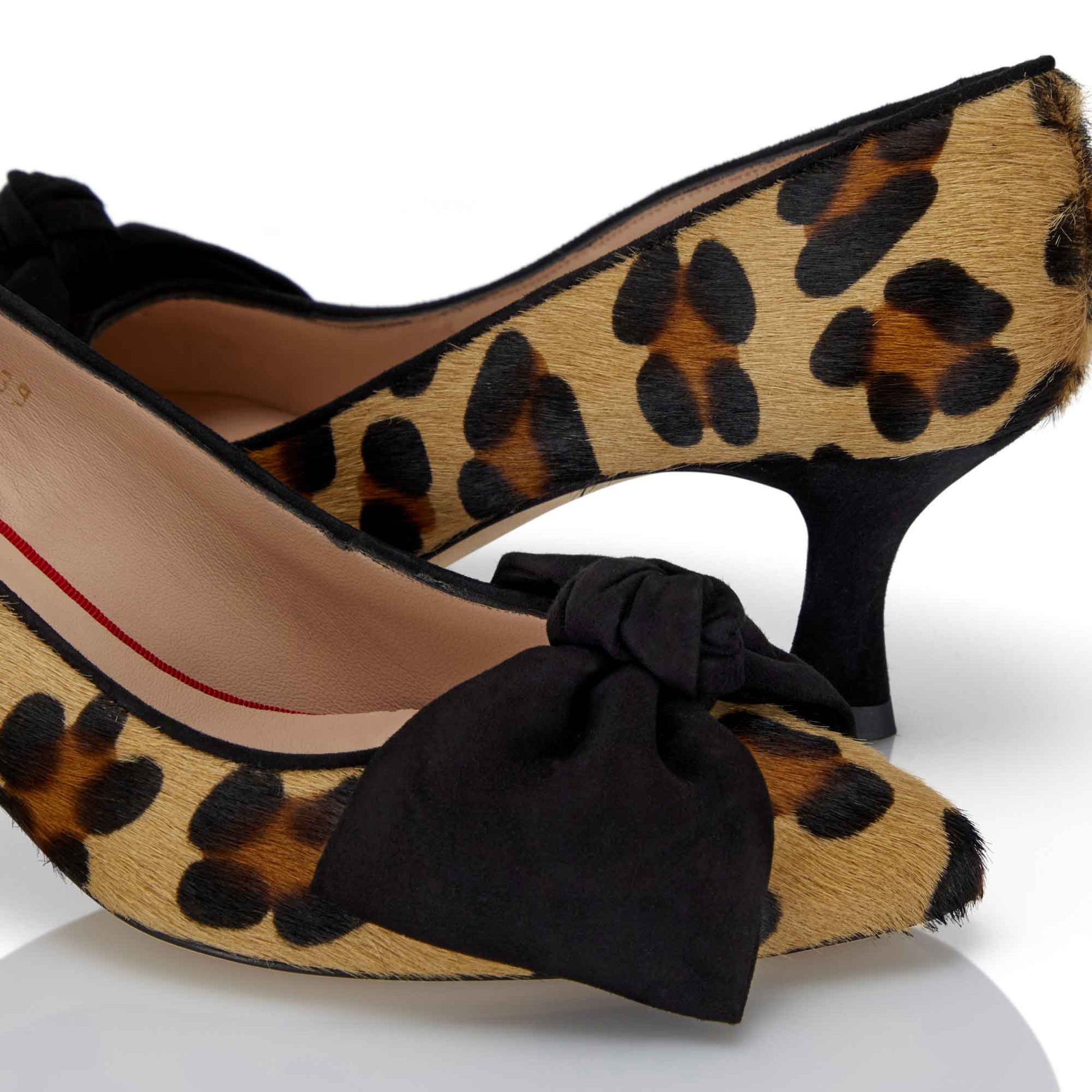 Introducing the new Bow Kitten Heels, a perfect blend of sophistication and comfort. Crafted from the luxurious leopard print pony hair, these kitten heels are designed to elevate your style without sacrificing ease. The classic pointed-toe silhouette is adorned with our iconic elegant black suede bow, adding a feminine touch to the timeless design. With a modest heel height, they are ideal for day-long wear, making them a versatile choice for any occasion with a pop of animal print.