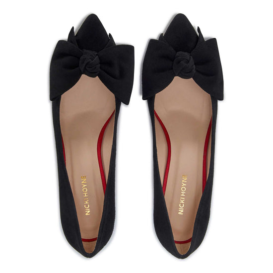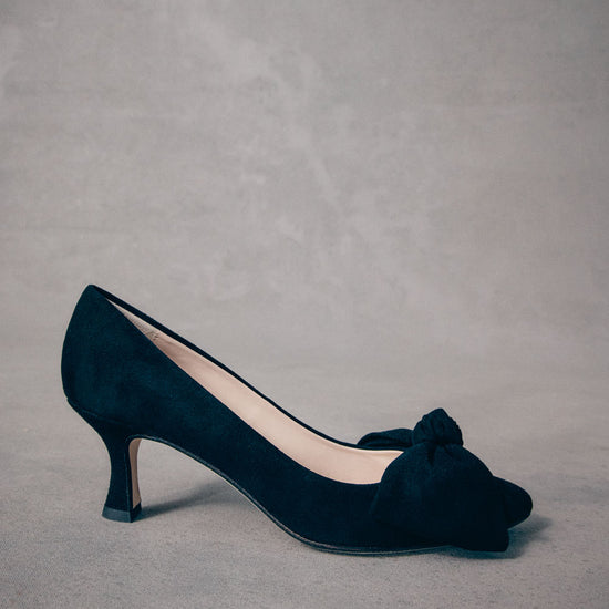 Introducing the new Bow Kitten Heels, a perfect blend of sophistication and comfort. Crafted from luxurious black suede, these kitten heels are designed to elevate your style without sacrificing ease. The classic pointed-toe silhouette is adorned with our iconic elegant bow, adding a feminine touch to the timeless design. With a modest heel height, they are ideal for day-long wear, making them a versatile choice for any occasion.