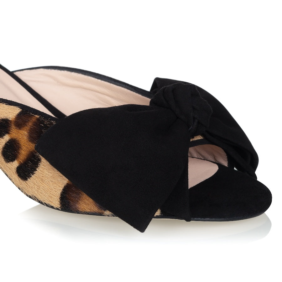 Crafted with precision, the leopard print design exudes a timeless allure, while the oversized black suede bow adds a touch of modern flair, creating a striking contrast that commands attention with every step. The peep toe silhouette adds a hint of allure, perfect for showcasing your pedicure or adding a touch of femininity to your ensemble.