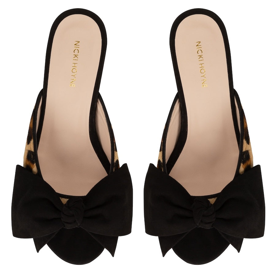 No matter the occasion, the Nicki Hoyne Oversized Bow Peep Toe Kitten Heels in Leopard Print with a Black Suede Bow are sure to elevate your style and turn heads wherever you go.