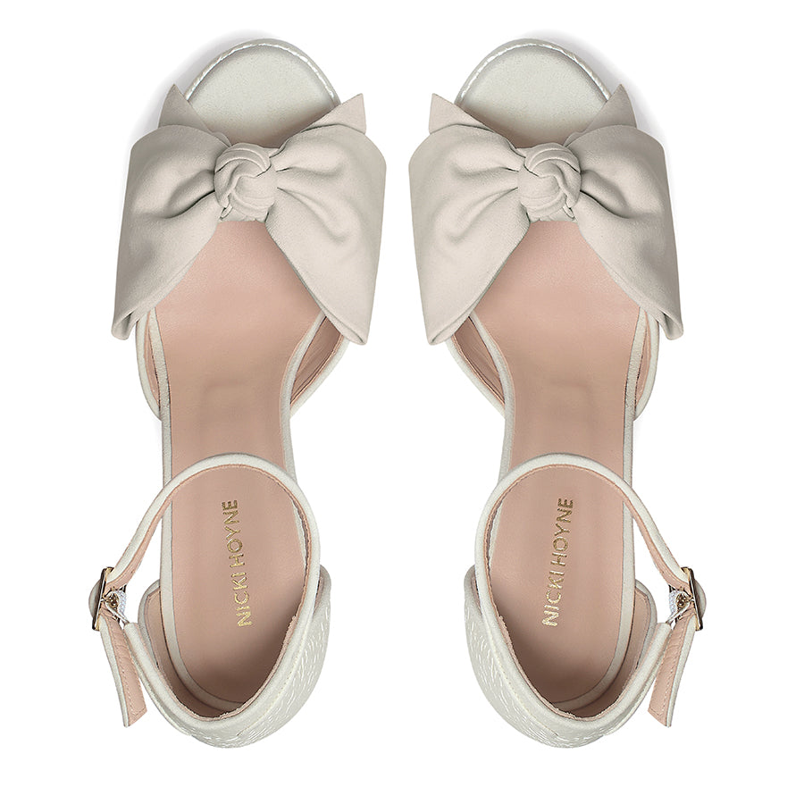 The Nicki Hoyne Bridal Bow Platform in Pearlescent Ivory textile is a modern romantic heel designed for the bride. Finished with an elegant ivory suede bow, this statement platform sandal delivers height, comfort and timeless bridal beauty. They are perfect for walking down the aisle and dancing all night.