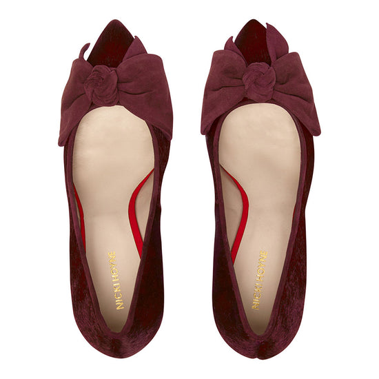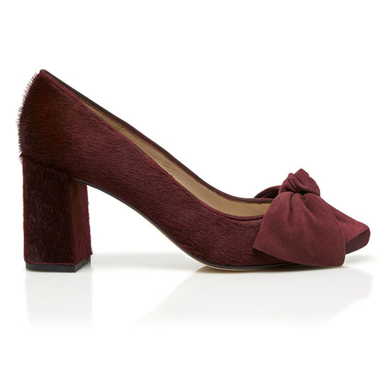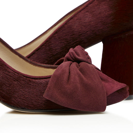 The Bow Pump Heel in Burgundy Hair with Suede Bow is timeless elegance with a modern twist. Handcrafted in Spain, this pointed-toe pump features luxurious burgundy pony hair leather topped with a soft suede bow for a feminine, standout finish.