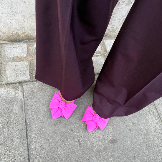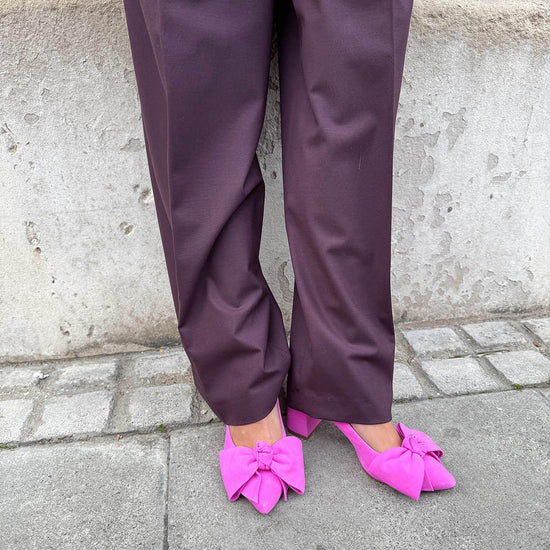 Step into elegance with the Nicki Hoyne Bow Pumps, crafted from vibrant pink suede. These striking pumps feature a bold, oversized bow over the classic point toe, with a 7cm statement block heel. With their plush suede finish and practical design, they effortlessly combine luxury and comfort. The block heel provides stability while offering an elevated touch of sophistication.
