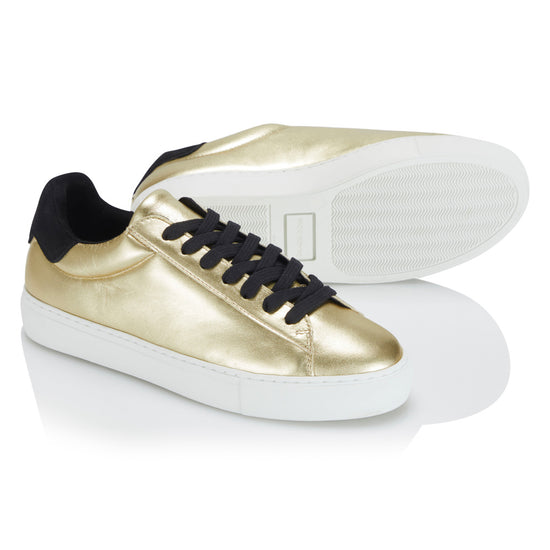 Make a bold statement with the Nicki Hoyne Classic Trainer in Gold Leather. Designed to turn heads, these trainers feature a sleek gold metallic leather upper that shines with every step. A white rubber sole provides comfort and durability, while black laces and a matching black heel tab add a striking contrast to the shimmering gold finish.