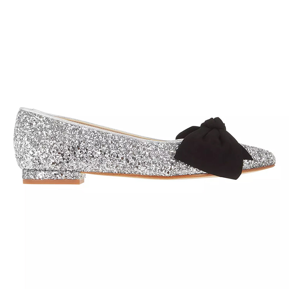 The perfect flat with a Nicki Hoyne glitter twist. The gorgeous and favourite Bow Pump has been turned into the perfect flat in a chic, classic silver glitter with black suede oversized bow.