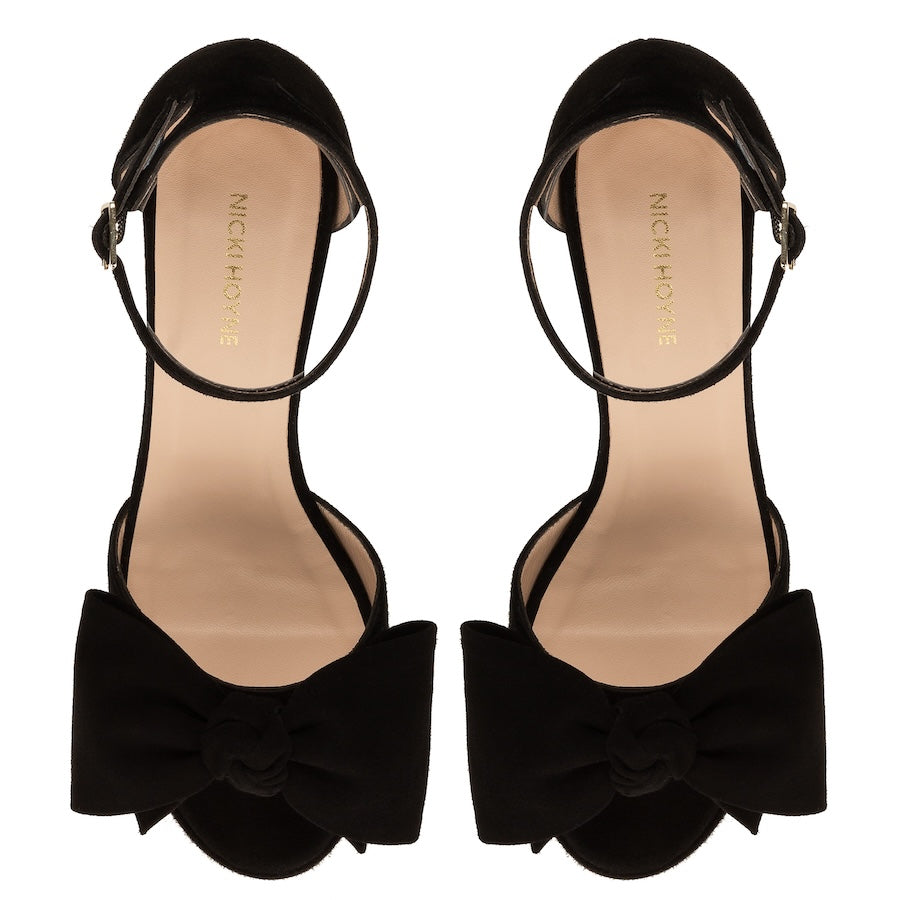 The Nicki Hoyne Bow Peep Toe Platform Heels in black suede are back by popular demand after selling out. This signature style blends timeless elegance with statement design, making it a must-have heel for eveningwear, events, and elevated everyday looks.