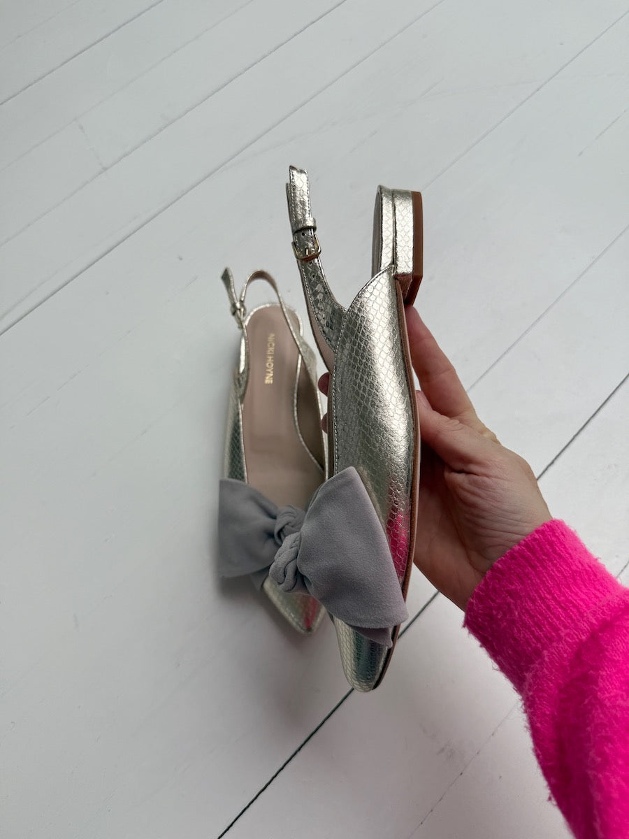 SECONDS - Bow Flat Slingback Shoe in Gold Python Leather with Grey Suede Bow