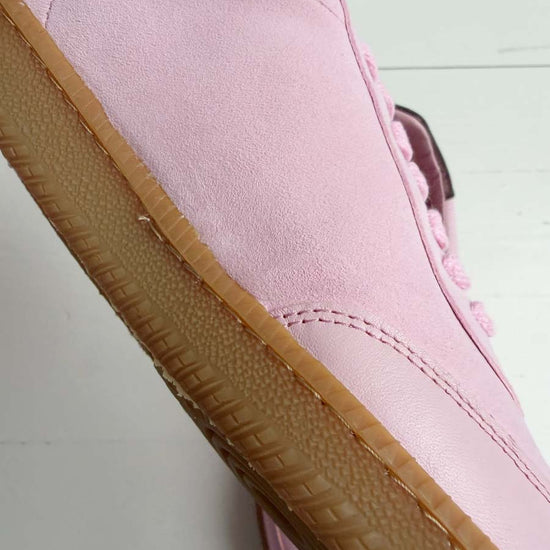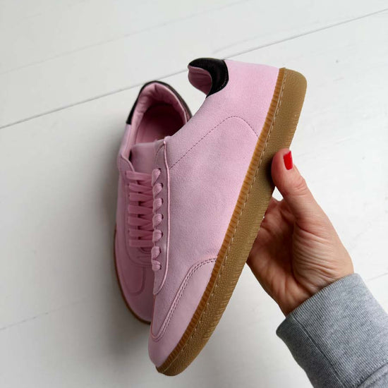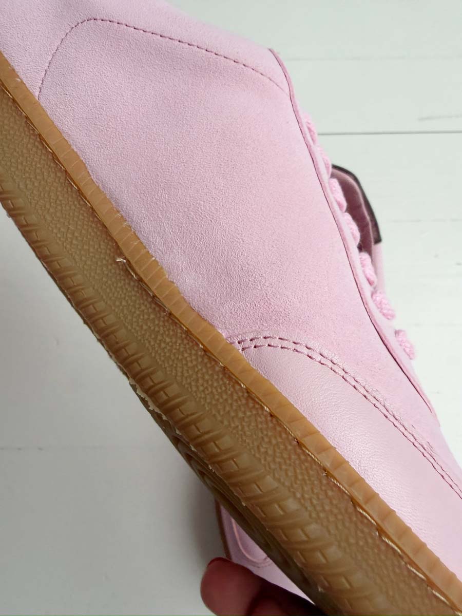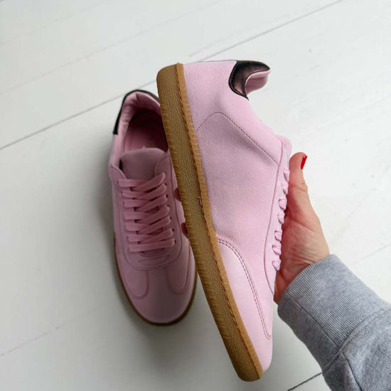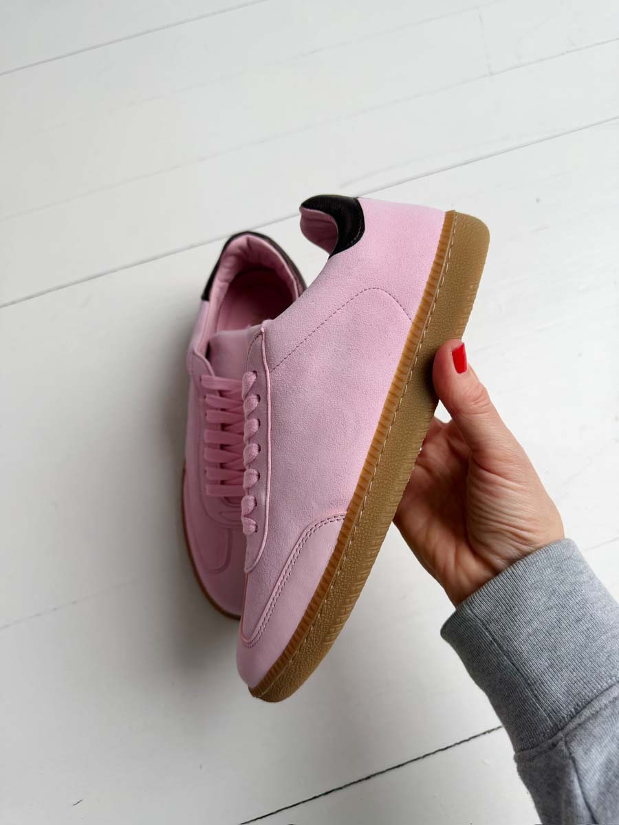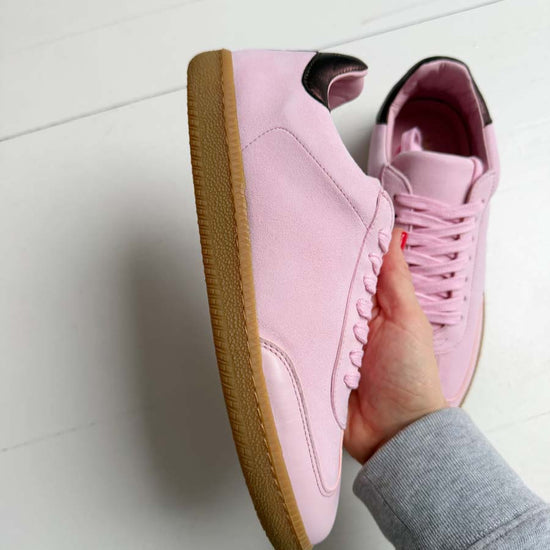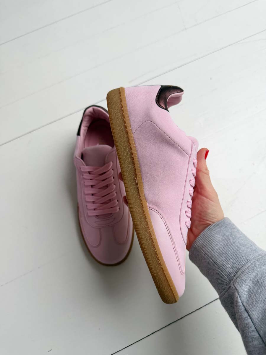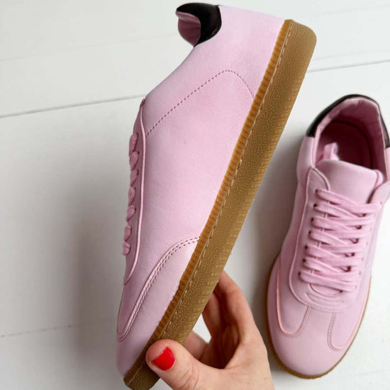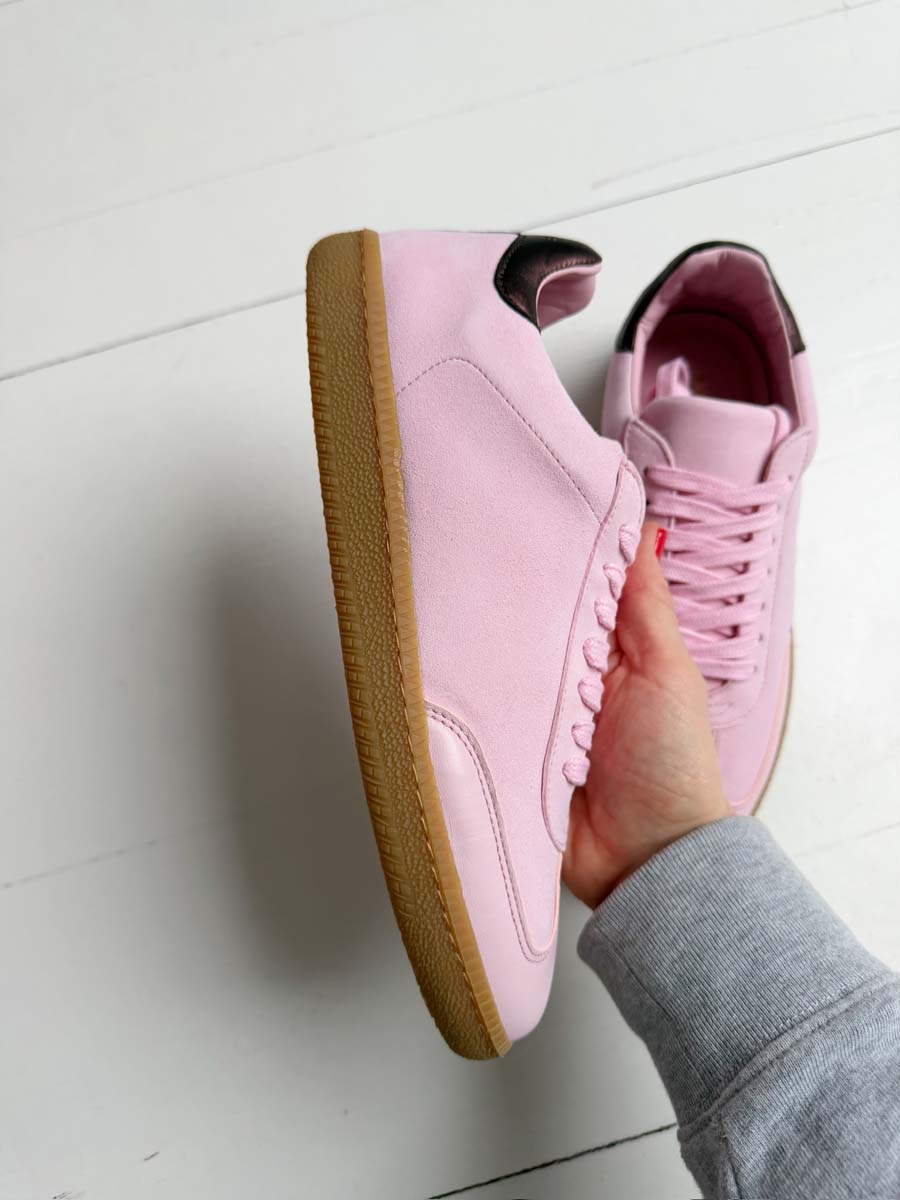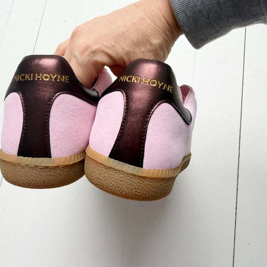 SECONDS - Sporty Trainer - Baby Pink Leather & Suede with Burgundy Metallic leather heel tab.