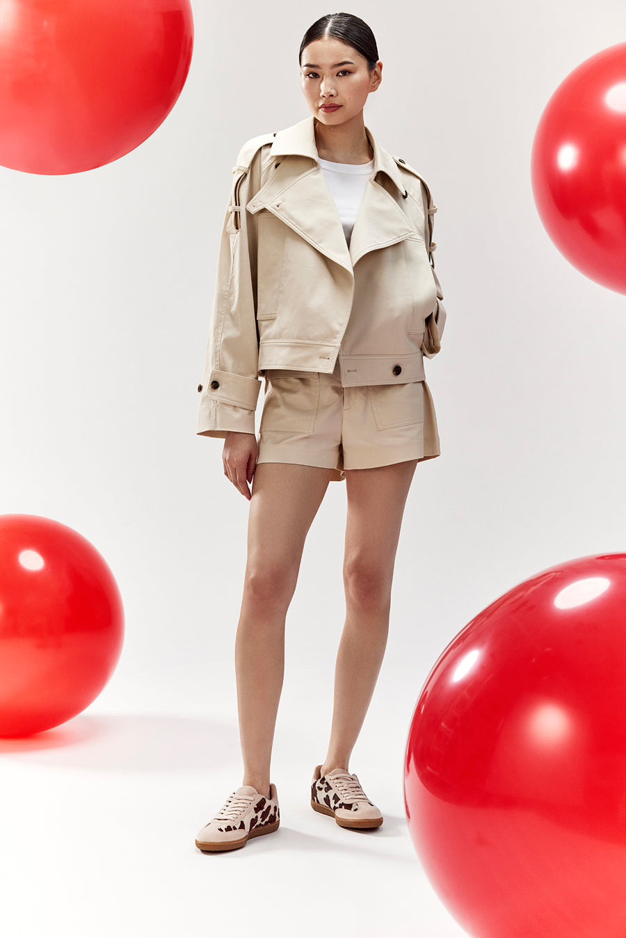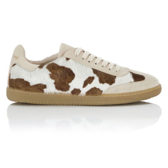 These trainers feature a bold cow print pony hair upper complemented by elegant beige suede accents.