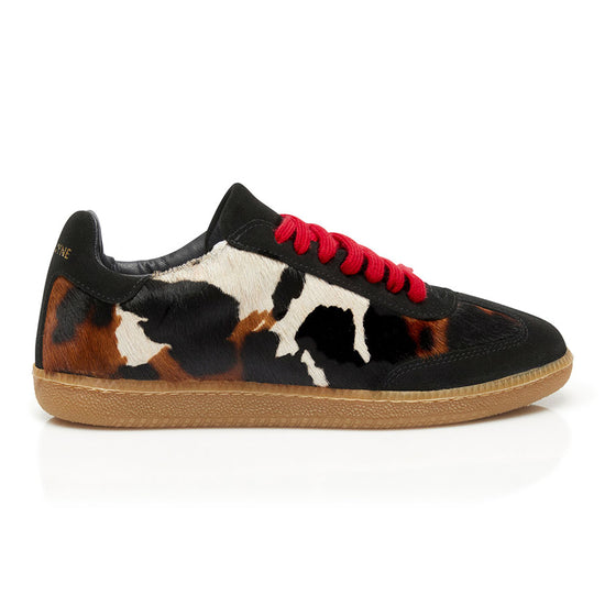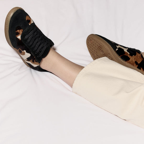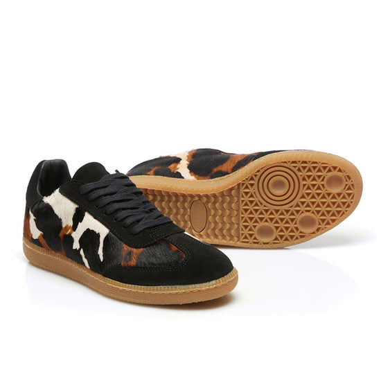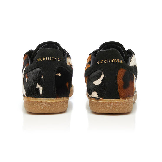 Make a bold statement with the new Cow Print Sporty Trainers. Featuring a striking cow print pony hair upper paired with luxurious black suede accents, these trainers are a perfect blend of edgy style and refined detail.
