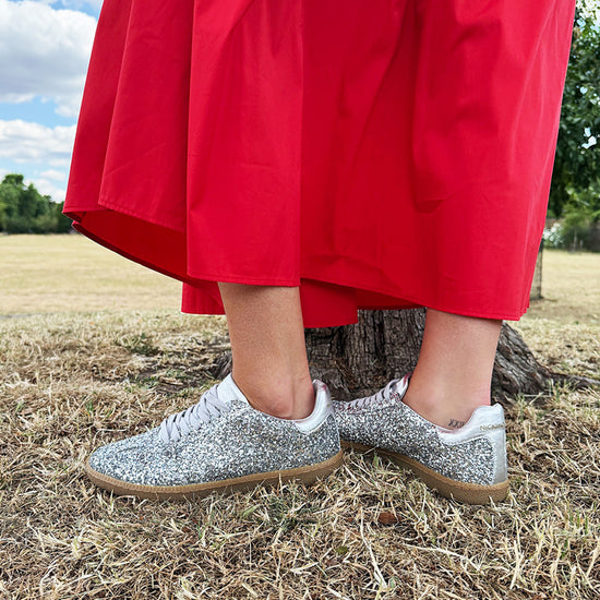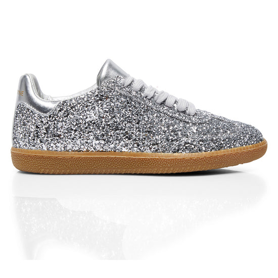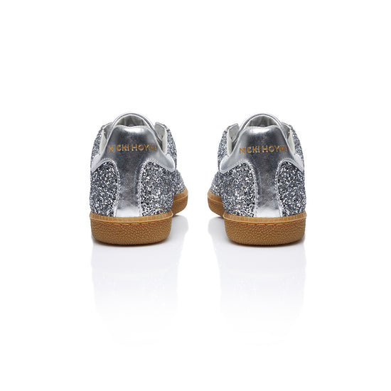 With their sleek yet playful design, these trainers are perfect for making a statement while maintaining a sporty, comfortable fit. Whether you're hitting the city streets or keeping it casual, the Nicki Hoyne Sporty Trainer in Silver Glitter is the ultimate combination of fun and function.