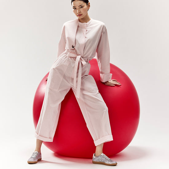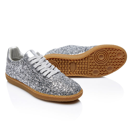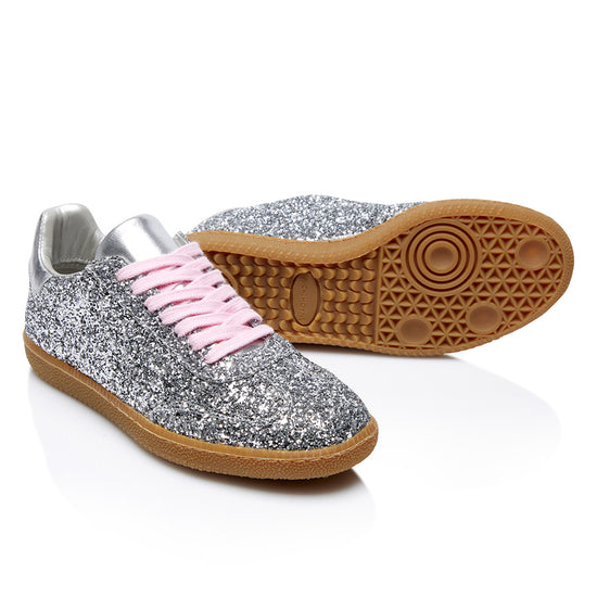These eye catching trainers feature a glitter silver upper paired with a gum coloured rubber sole, offering a relaxed sporty shape that's both fashionable and comfortable. The metallic silver leather heel tab and tongue offer a subtle textural contrast.