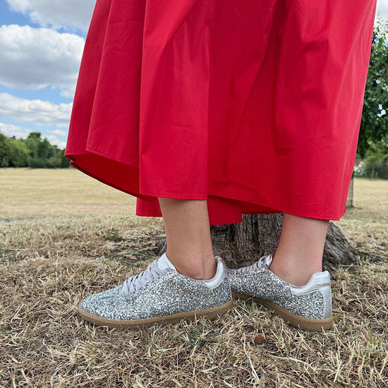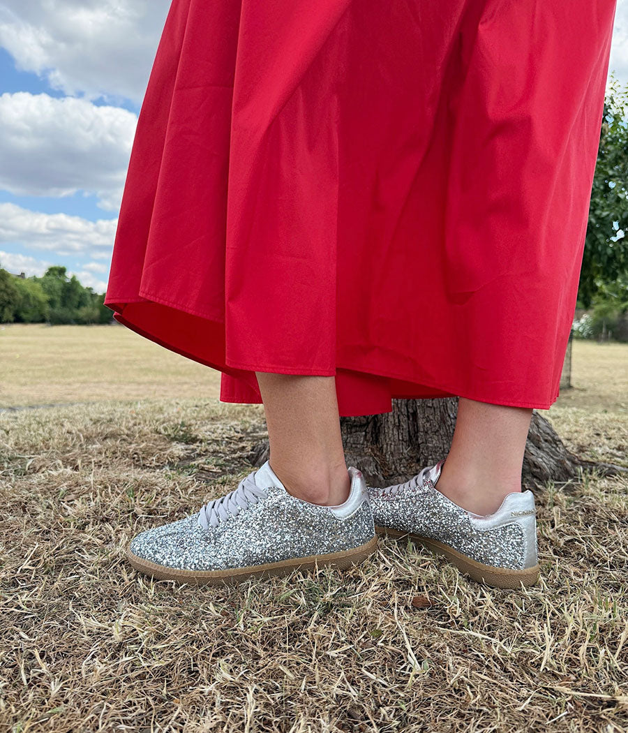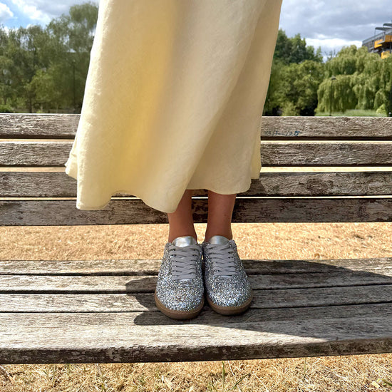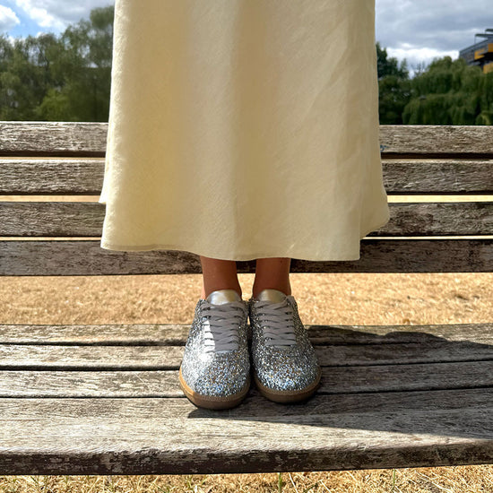 The Nicki Hoyne Sporty Trainers in silver glitter will add joy to any outfit: summer dress, midi skirt or jeans. These trainers are perfect for brightening your day while maintaining a sporty, comfortable fit.