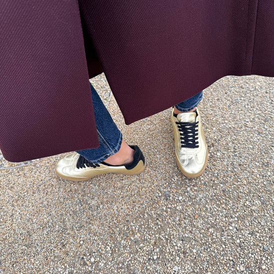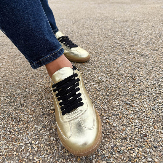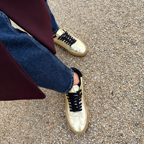 Shine bright with the Nicki Hoyne Sporty Trainer in Gold Metallic Leather, the perfect fusion of glam and comfort. The sleek gold metallic leather upper makes these trainers a true statement piece, while the gum coloured rubber sole offers a relaxed, sporty vibe. Black laces and a black heel tab provide a striking contrast, adding depth to the bold metallic design.