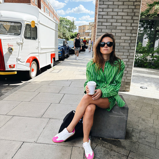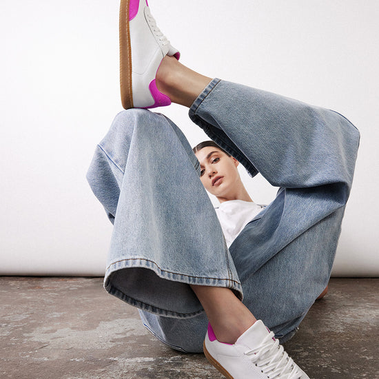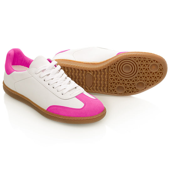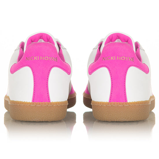Elevate your sneaker game with the Sporty Trainer in White Leather and Neon Pink Suede. Designed for the fashion forward, these trainers seamlessly blend luxury with a playful pop of colour, embodying Nicki's commitment to high quality and unique designs.