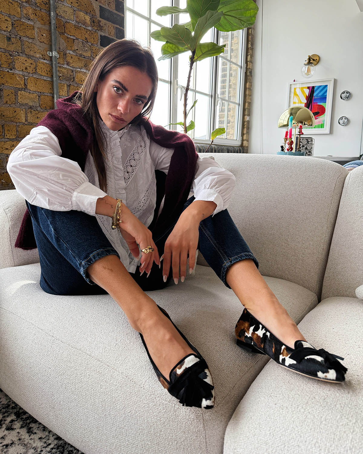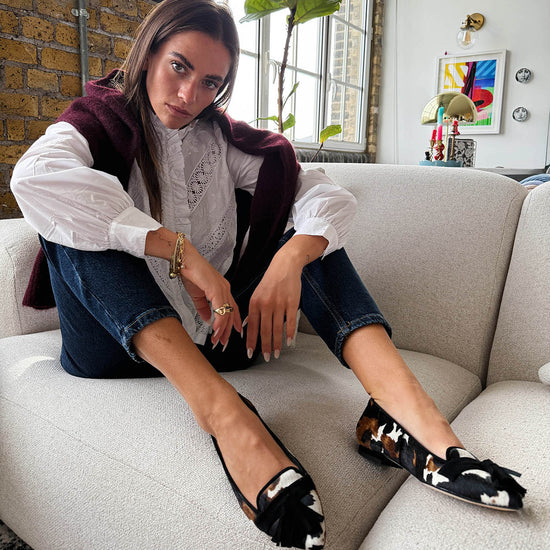 The striking Nicki Hoyne Tassel Flat in Cow Print Pony Hair combines classic craftsmanship with modern edge, featuring a bold cow print pattern in rich tones of brown, black, and ivory. Finished with a chic black tassel detail, it’s a playful yet polished statement piece that channels this season’s on-trend cowgirl aesthetic.