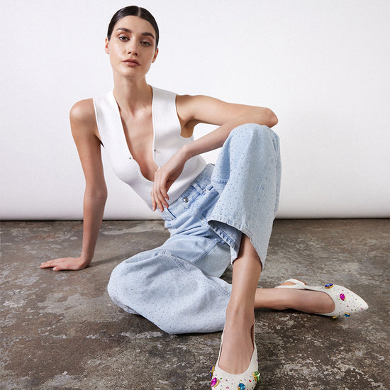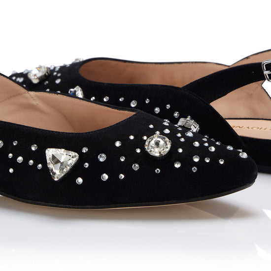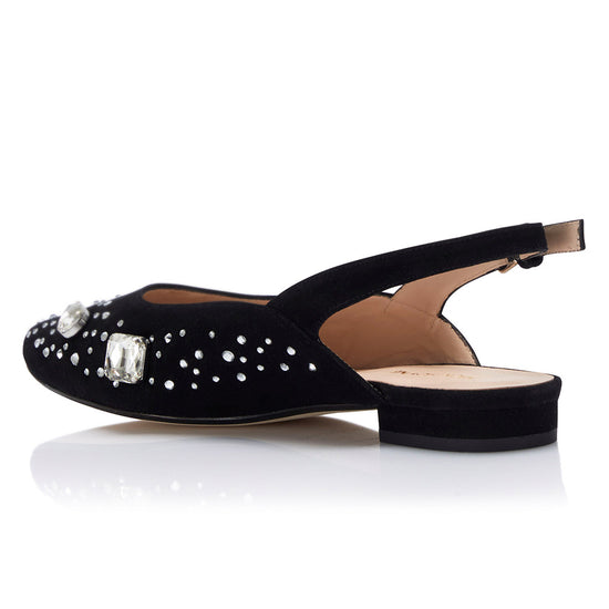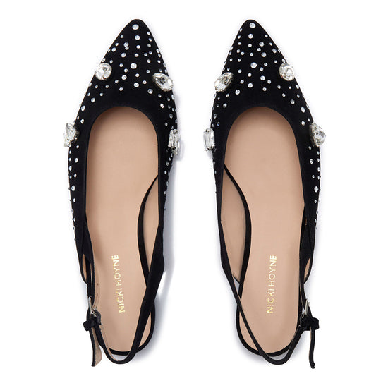 Indulge in elegance with Nicki Hoyne's "The Moment" Flat Slingback in Black Suede, a captivating blend of sophistication and sparkle. Crafted with meticulous attention to detail, these slingback shoes boast a refined point toe silhouette, elevated by clear crystal embellishments that shimmer with every step. The adjustable slingback strap ensures a personalised fit and added comfort, making them perfect for all-day wear.