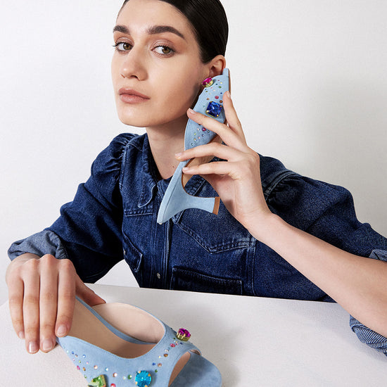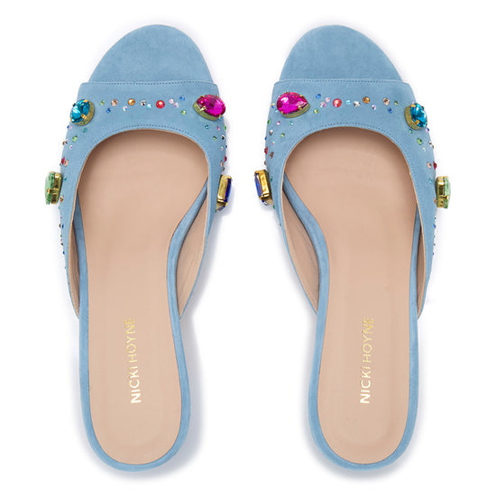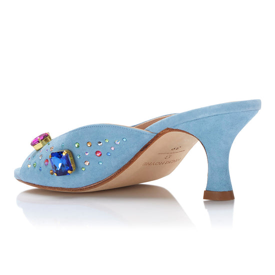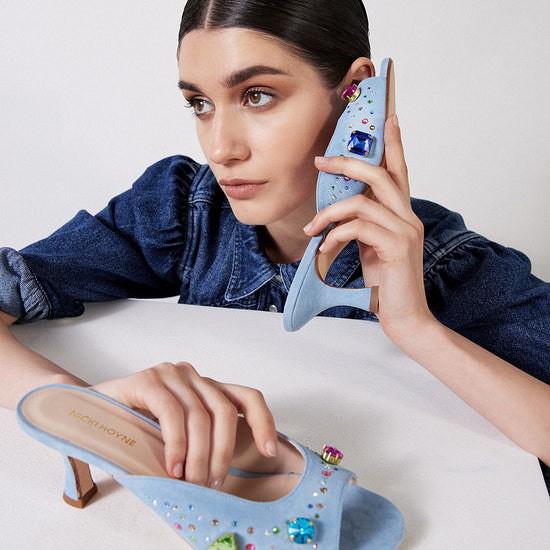 Step into the spotlight with Nicki Hoyne's The Moment Peep Toe Kitten Heels in Baby Blue Suede with Multicolour Crystal embellishment. These exquisite heels stand at a graceful height of 5cm, striking the perfect balance between elegance and comfort.